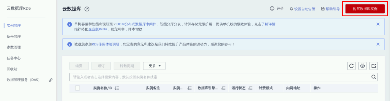 2. 在云数据库控制台页面,点击右上角的“购买数据库实例”。