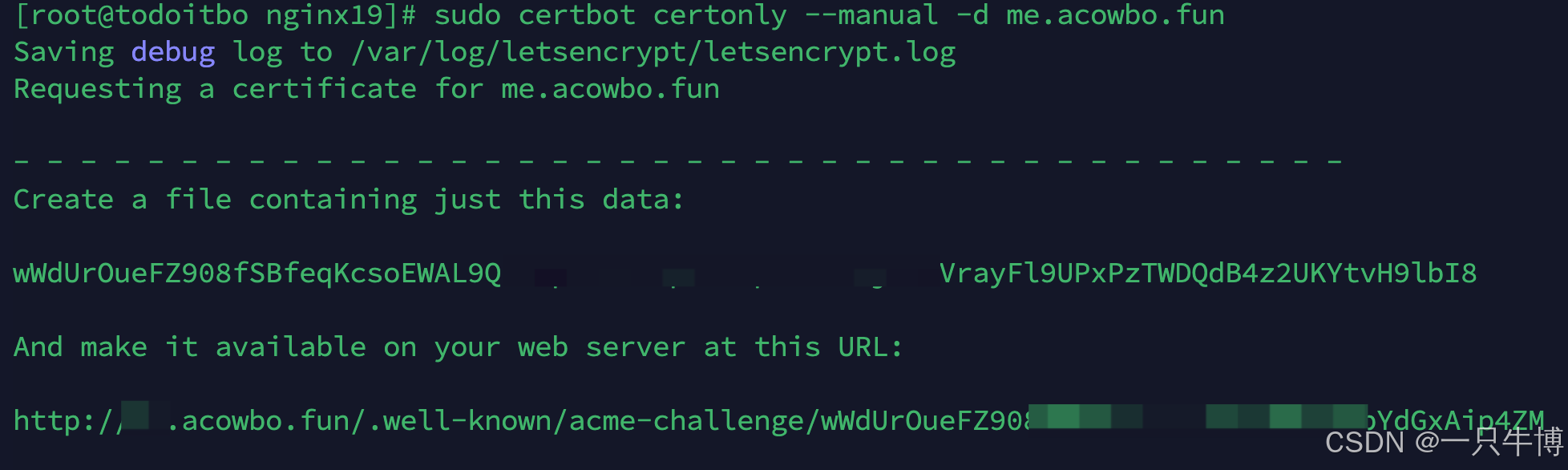 命令:sudo certbot certonly --manual -d me.acowbo.fun