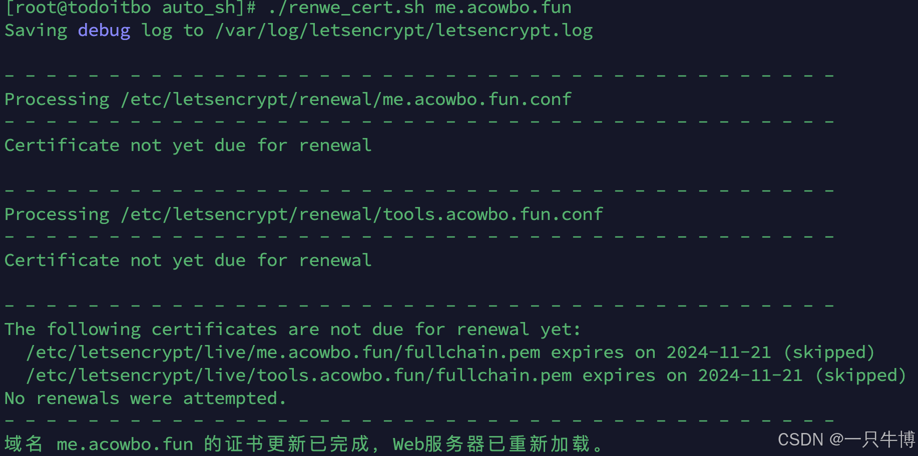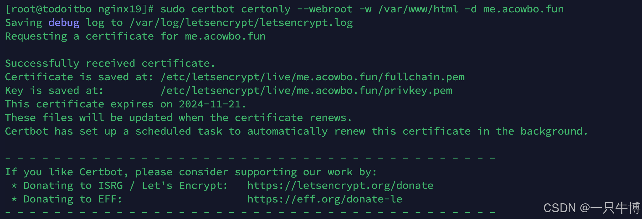 命令:sudo certbot certonly --webroot -w /var/www/html -d me.acowbo.fun