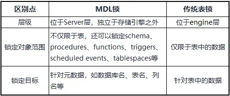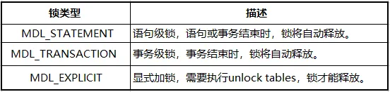 而TABLE, FUNCTION, PROCEDURE, TRIGGER,EVENT, USER_LEVEL_LOCK(用于user-level的锁, GET_LOCK(), RELEASE_LOCK()等函数), LOCKING_SERVICE(用于locking service), SRID(空间参照系统), ACL_CACHE ACL(access-control list缓存), COLUMN_STATISTICS属于object lock。