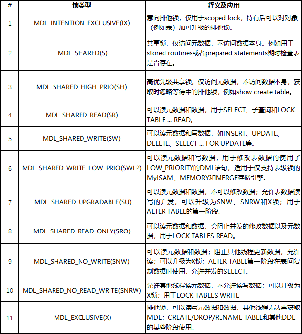 为了提高并发度,MDL被细分为了11种类型/级别,其数据结构为enum_mdl_type。