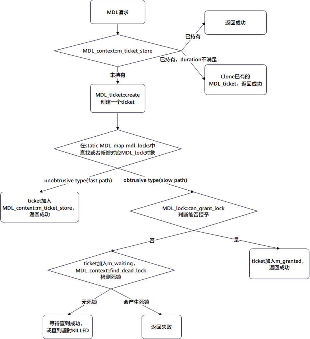 随后,在static MDL_map::mdl_locks中查找或者新增对应的MDL_lock对象, 对于每个锁请求,评估其是否符合fast path条件。如果符合,将ticket加入m_granted,直接返回成功;如果不符合,只能使用slow path的锁,还需要MDL_lock::can_grant_lock判断能否直接授予。若能直接授予,将ticket加入m_granted后,返回成功。若不能直接授予,ticket加入m_waiting后,调用MDL_context::find_dead_lock进行死锁检测。如果检测到死锁,返回失败。如果没有检测到死锁,请求进入等待状态,直到锁被成功授予或达到超时时间。