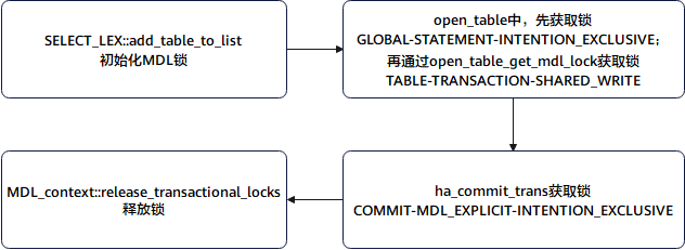 在open table阶段,INSERT/UPDATE/DELETE语句会先后获取两个锁,分别是GLOBAL-STATEMENT-INTENTION_EXCLUSIVE和TABLE-TRANSACTION-SHARED_WRITE。而在commit阶段,会获取COMMIT-MDL_EXPLICIT-INTENTION_EXCLUSIVE锁。