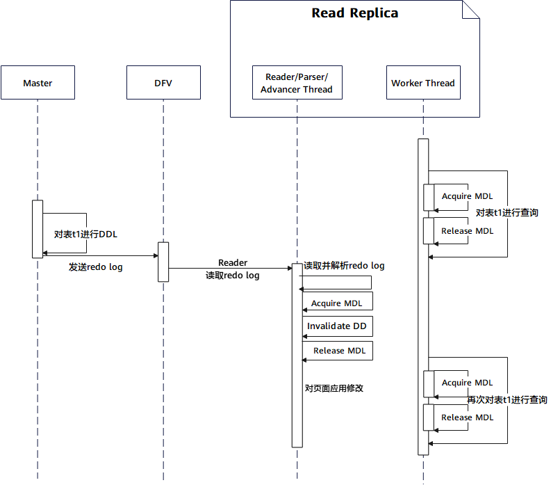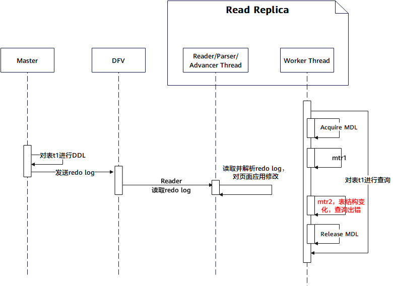 如图6所示,当TaurusDB的备机正在执行的查询涉及的表被主机修改了表结构或直接drop时,会产生冲突。针对类似这种场景,需要将主机DDL时涉及的MDL操作同步到备机,以解决上述问题。