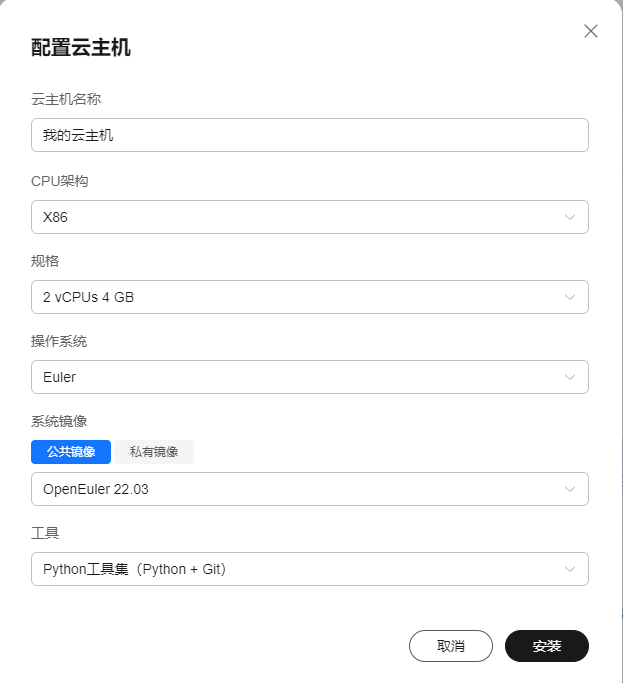 点击“配置云主机”,出现下图所示,设置操作系统为Euler。