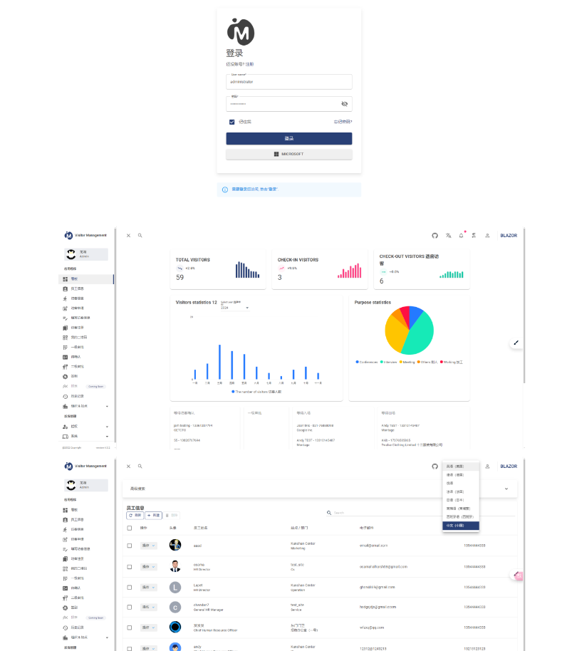一款基于 .NET + Blazor 开发的智能访客管理系统,访客系统的主要作用是简化并优化访客管理流程,提升安全性和效率。它通过数字化手段替代传统纸质登记,实现快速、准确的访客信息录入与追踪。该系统能够记录访客进出时间、地点及活动轨迹,有助于机构加强安全管理,同时提供便捷的访客体验。总之,访客系统是现代机构管理中不可或缺的一部分,它确保了访客管理的规范性和高效性。