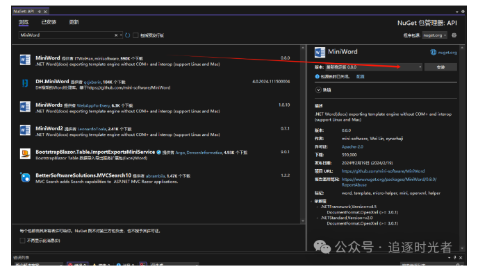 【摘要】 项目介绍MiniWord是一个基于.NET开源、易于使用的.NET Word模板导出引擎,无需安装Office COM+,适用于Windows、Linux和Mac。NuGet包安装命令安装dotnet add package MiniWord --version 0.8.0NuGet包管理器Word表格导出示例标签值为 IEmerable<Dictionary<string,object>>...