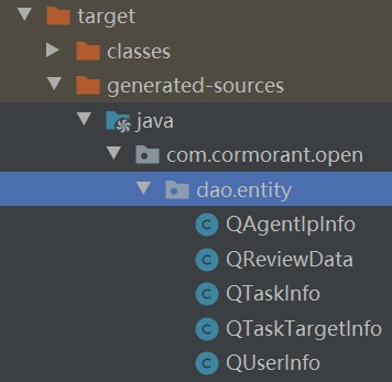 双击 compile 命令执行,执行完成后会在 pom.xml 配置文件内配置生成目录内生成对应实体的 QueryDSL 查询实体。