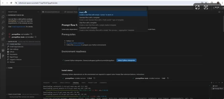 - 启动 Codespaces 后,在 VS Code 左侧 “Extensions” 中搜索并安装 “Azure Prompt Flow” 扩展程序(名称可能随版本不同,请以官方发布为准)。