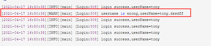 举例说明:其中红线框起来的就是注入点,其中userName受用户控制,下面其他的日志,都是用户构造,通过注入换行符,看起来就像是一条正常的日志