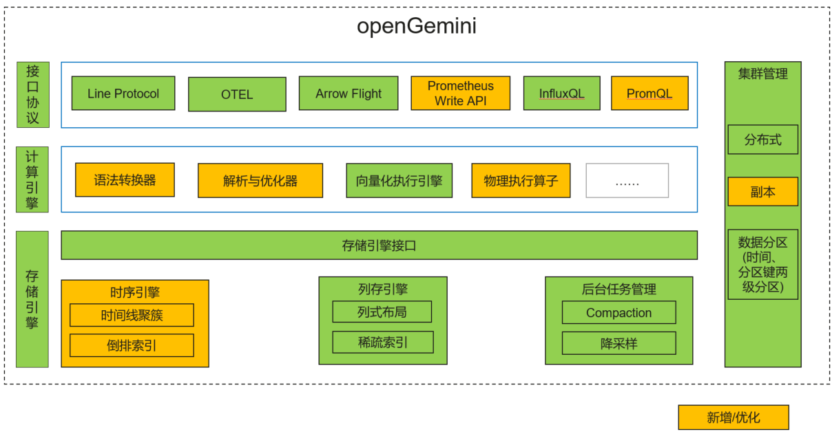 openGemini的整体框架主要分为四个部分,包括支持的接口协议,绿色部分是已经支持的协议,比如数据行写入协议,influxql查询。黄色部分是新版本增加和优化的部分,接口层就包括新兼容的prom写入api和查询的promql。计算层主要对解析查询语句,生成执行计划,包括之前就有的解析和优化器,向量化执行引擎、各种物理算子的实现等。