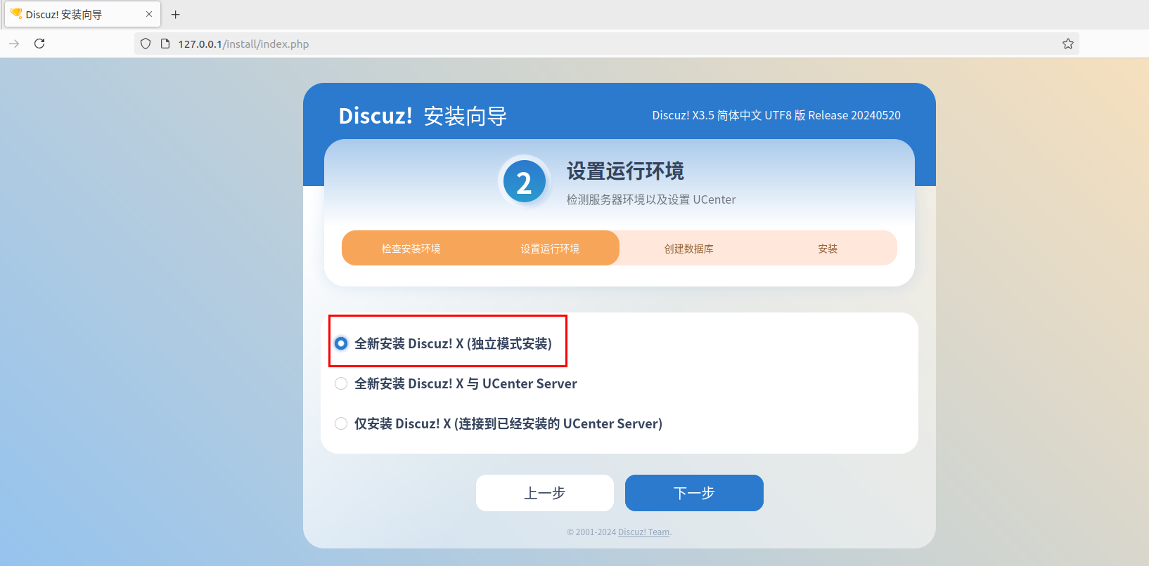 5) 确认状态正常后,进入下一步设置运行环境。初次安装选择“全部安装Discuz! X(含UCenter Server)”,进入下一步开始创建数据库。