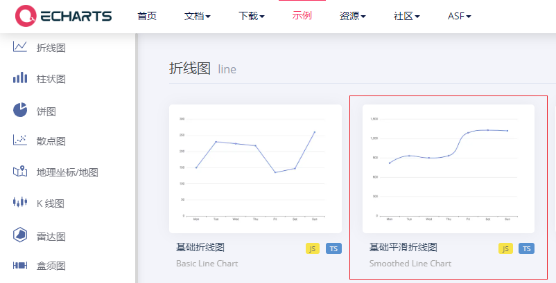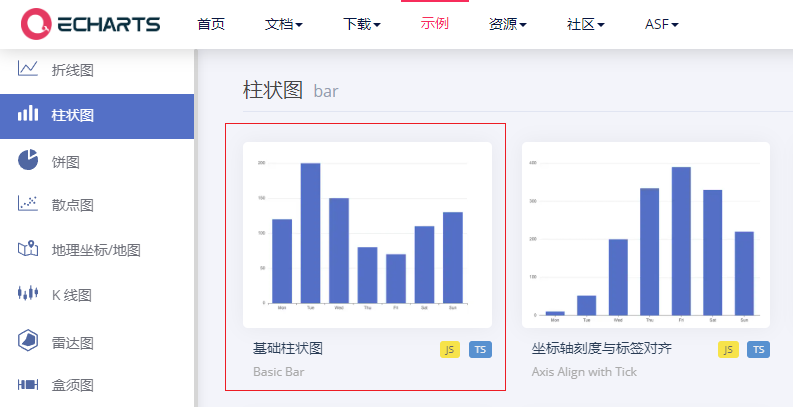 本次实战目标需要用到Echarts上的折线图和柱状图,网址(https://echarts.apache.org/examples),如下图所示: