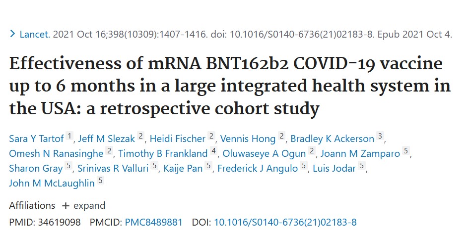 - 标题(英文): Effectiveness of mRNA BNT162b2 COVID-19 vaccine up to 6 months in a large integrated health system in the USA: a retrospective cohort study