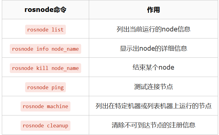 以上命令中常用的为前三个,在开发调试时经常会需要查看当前node以及node信息,所以请记住这些常用命令。如果想不起来,也可以通过rosnode help来查看rosnode命令的用法。
