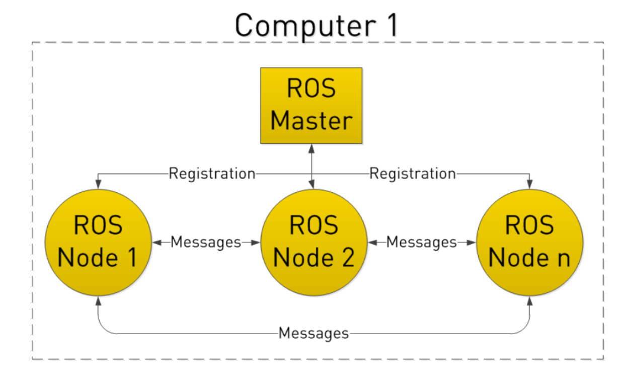 由于机器人的元器件很多,功能庞大,因此实际运行时往往会运行众多的node,负责感知世界、控制运动、决策和计算等功能。那么如何合理的进行调配、管理这些node?这就要利用ROS提供给我们的节点管理器master, master在整个网络通信架构里相当于管理中心,管理着各个node。node首先在master处进行注册,之后master会将该node纳入整个ROS程序中。node之间的通信也是先由master进行“牵线”,才能两两的进行点对点通信。当ROS程序启动时,第一步首先启动master,由节点管理器处理依次启动node。