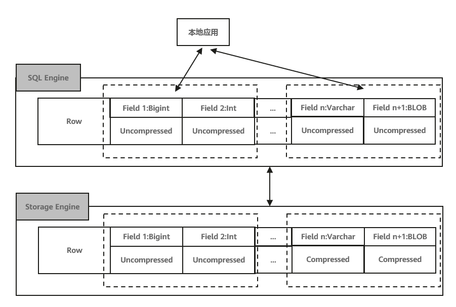 TaurusDB压缩/解压缩实现的效果如图4所示,对于SQL Engine层而言,看到的内容均为未压缩的数据,而压缩/解压缩的动作实际发生在Storage Engine层,且只针对具有压缩属性的列单独进行压缩。