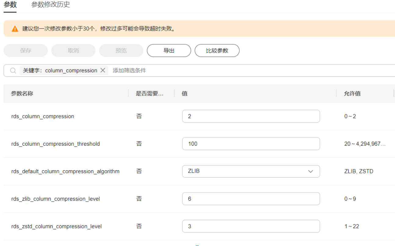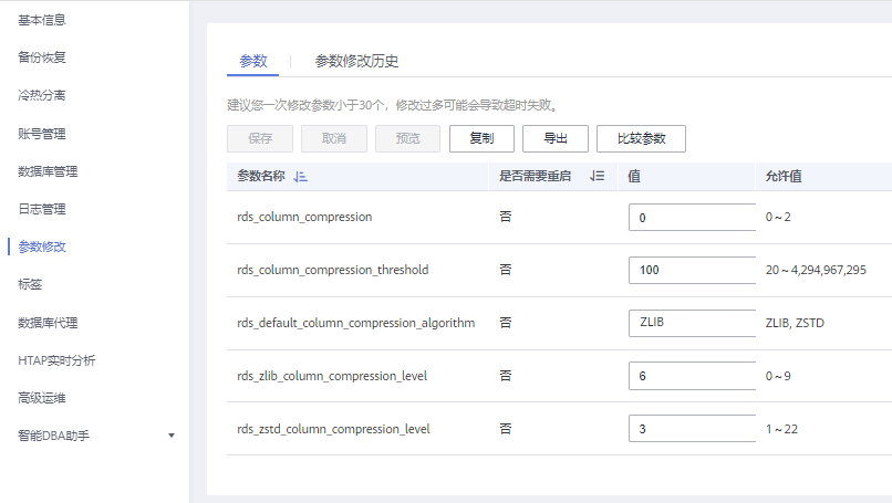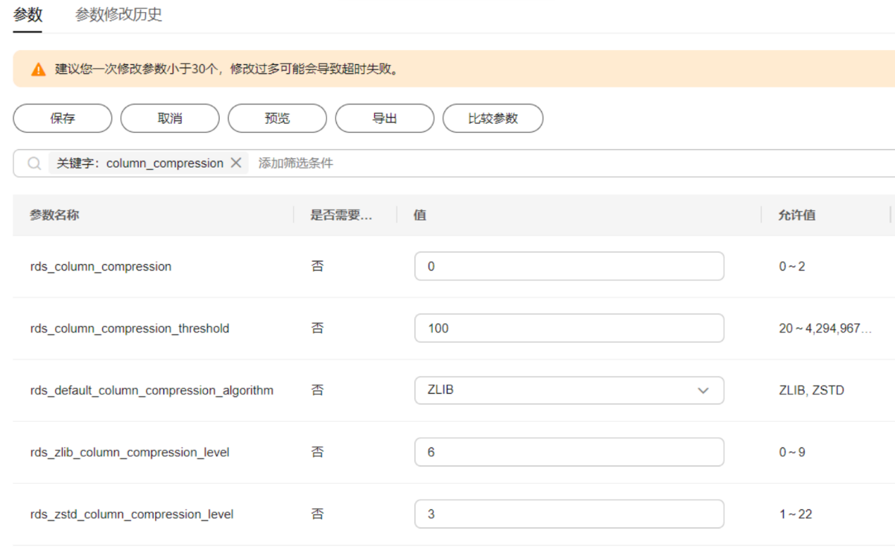 为了使得TaurusDB字段压缩特性更方便地被用户所使用,已开放5个相关参数,在“实例管理”处点击“参数修改-参数”页面即可调整字段压缩参数,如图5所示。