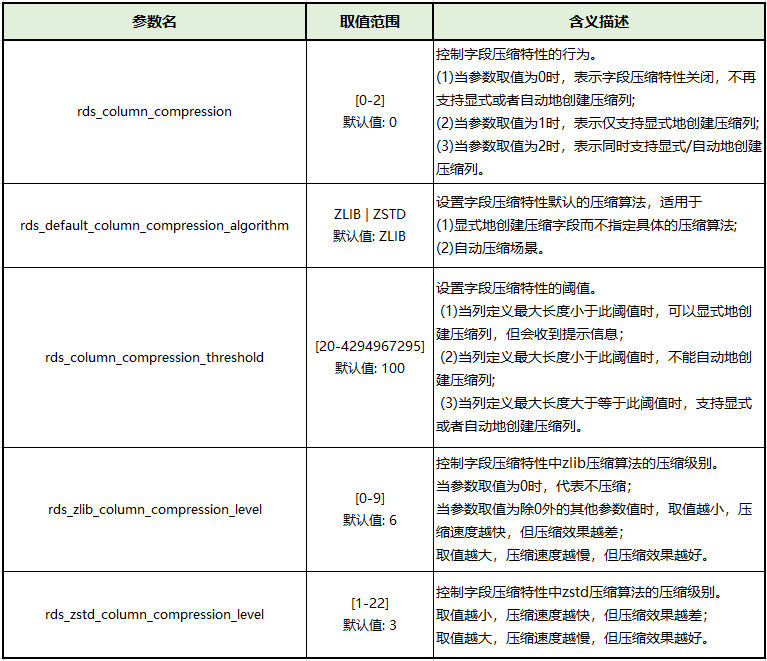 例如,显式地创建压缩字段(如图5,设置默认压缩算法参数rds_default_column_compression_algorithm=ZLIB),在SQL语句中对需要进行压缩的字段显式地标记出压缩属性compressed,若不单独指定压缩算法,则按照rds_default_column_compression_algorithm参数指定的算法使用。