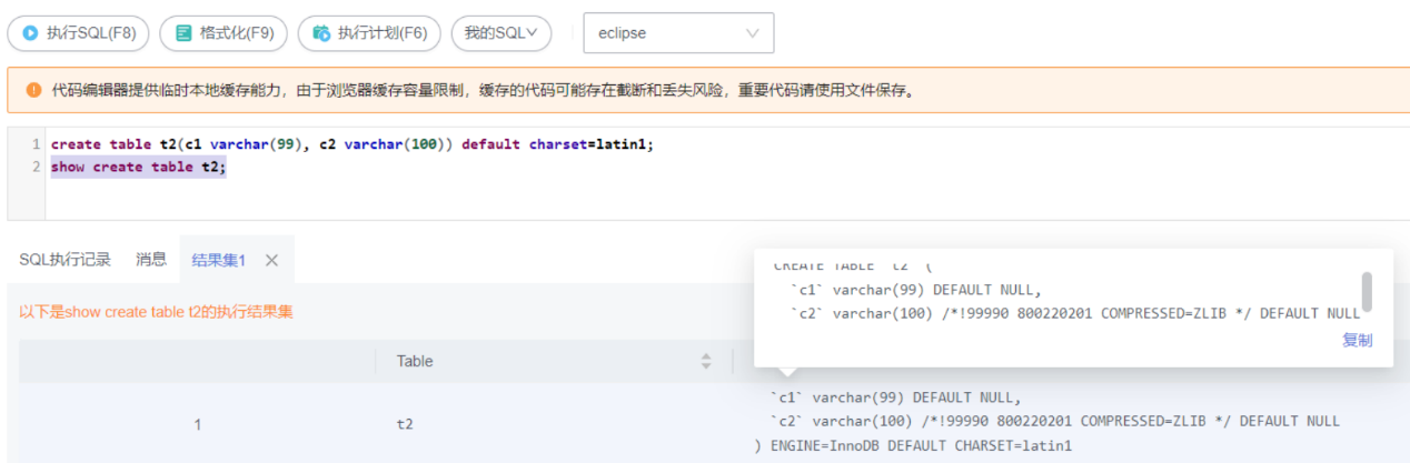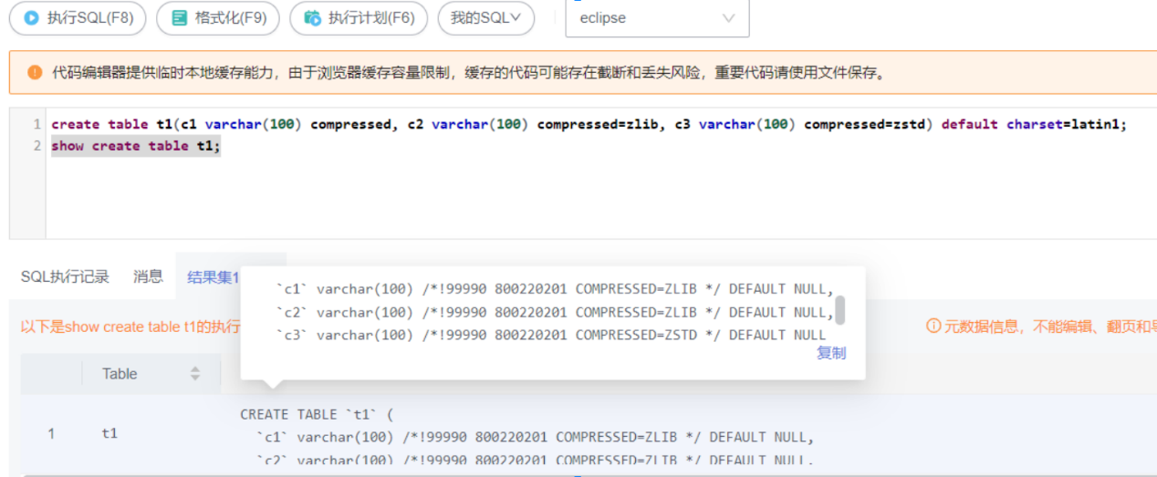 通过展示表结构信息,如果发现其中包含/*!99990 800220201 COMPRESSED=xxxx */的注释内容,可认为该表中的某些字段已使用字段压缩特性,例如:
