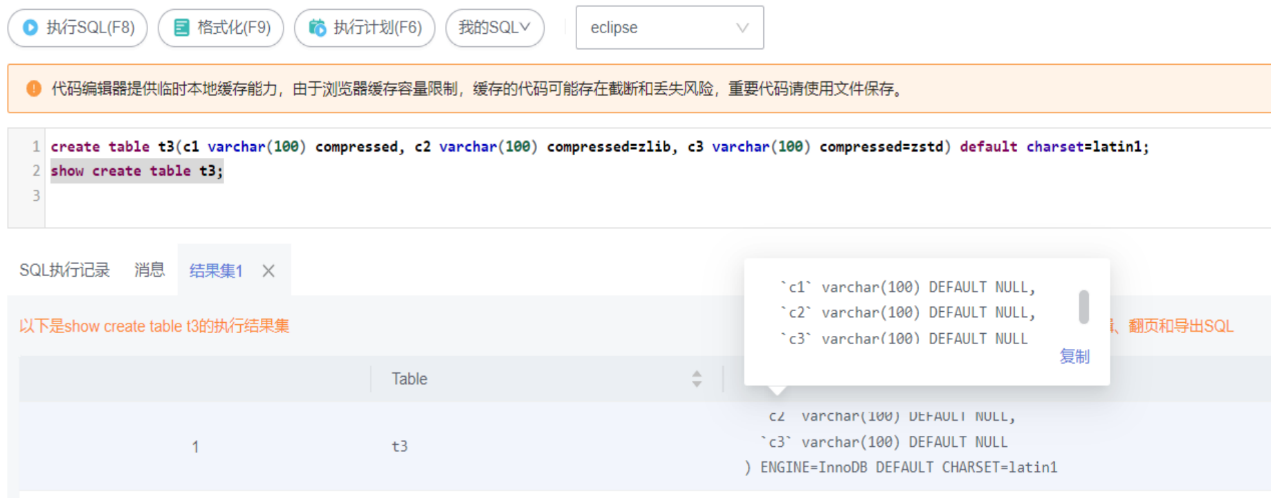 create table t3(c1 varchar(100) compressed, c2 varchar(100) compressed=zlib, c3 varchar(100) compressed=zstd) default charset=latin1;