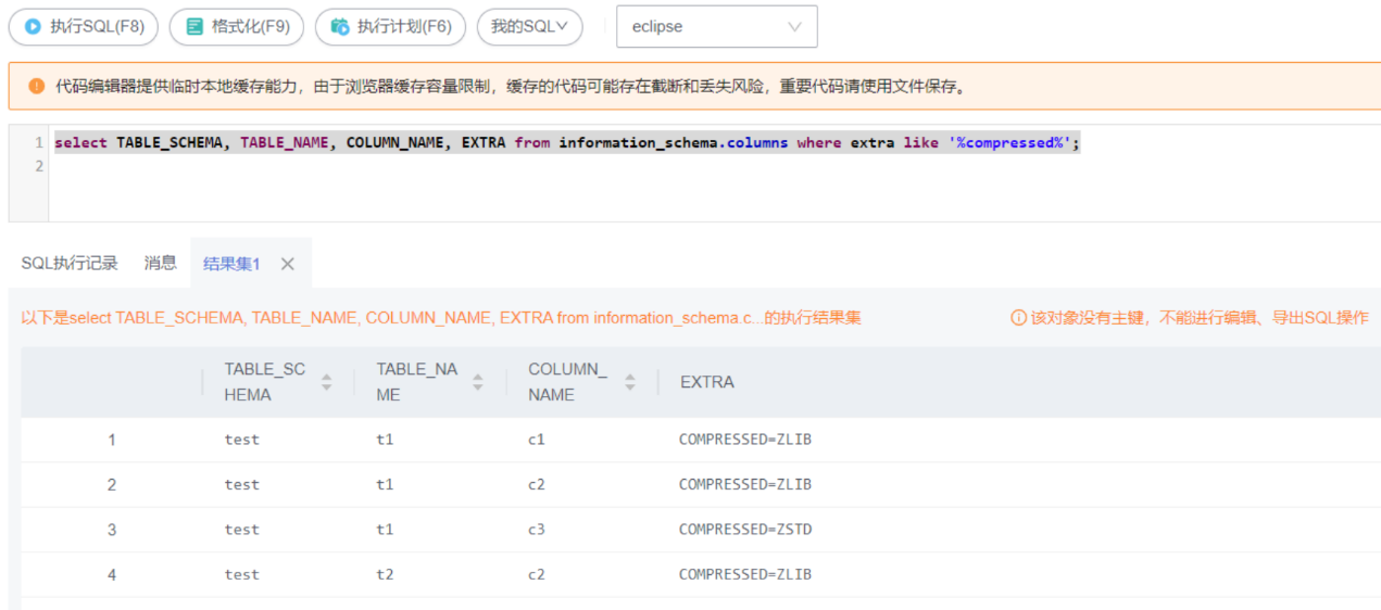 利用系统视图information_schema.columns查询压缩字段,执行如下SQL语句,
