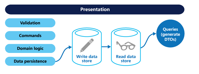 Queries(查询):查询对象被传递给查询处理器,查询处理器直接从读数据存储中获取数据,并生成DTOs返回给展示层。