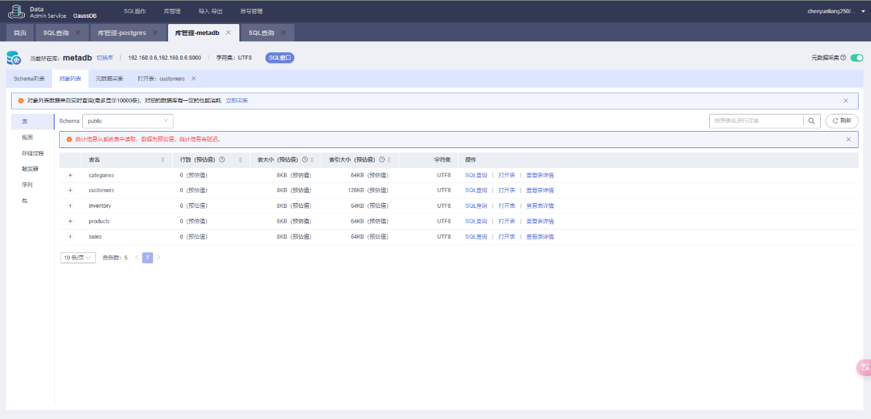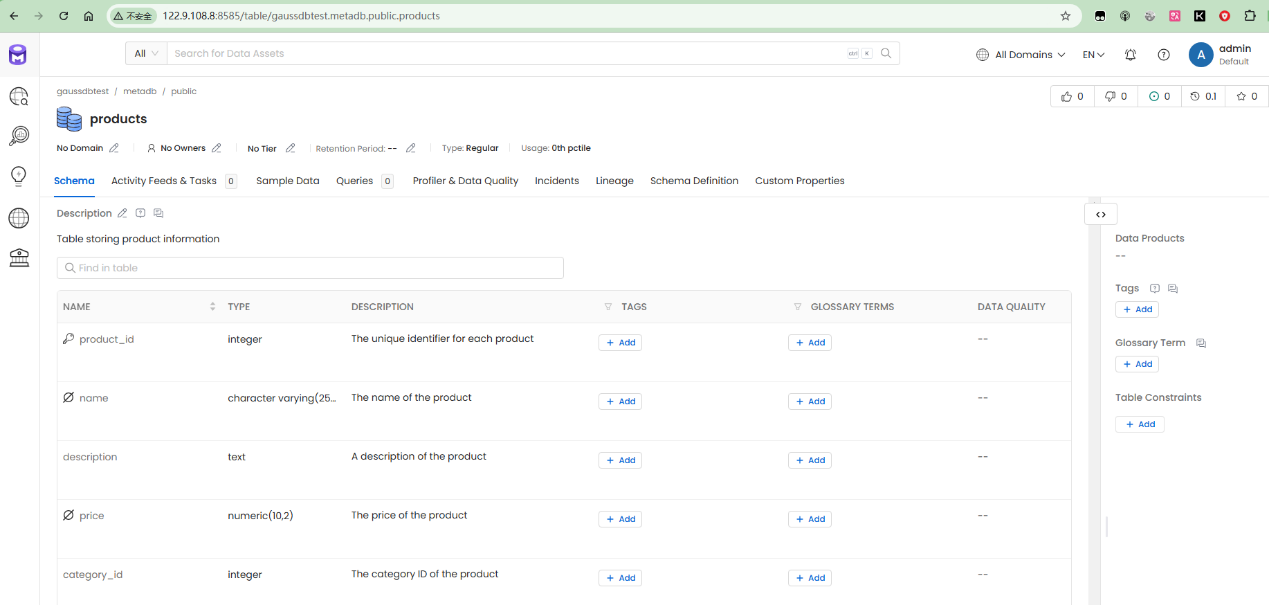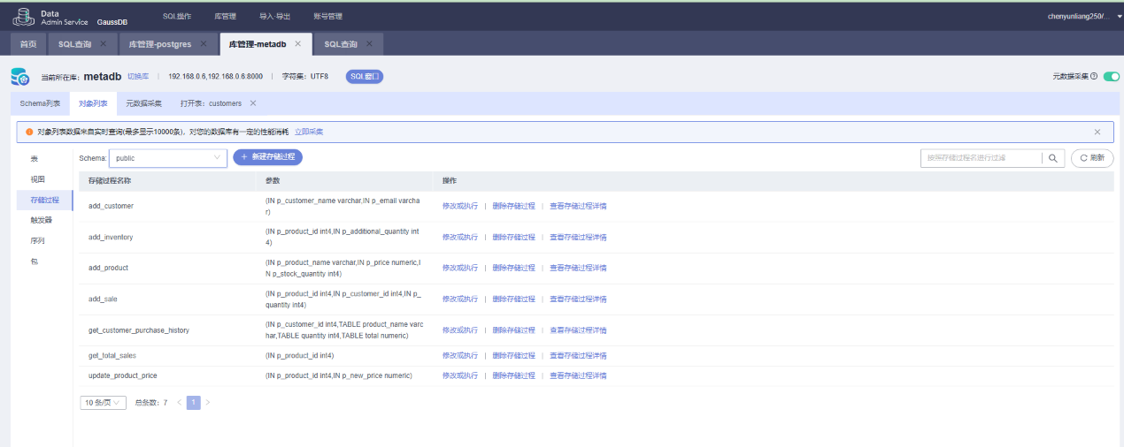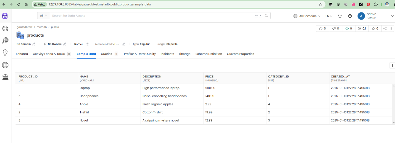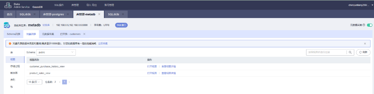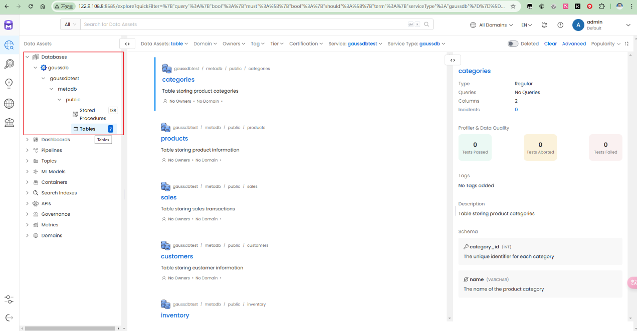 经过分析,采用在GaussDB中创建样例数据库,并添加一些表,视图,存储过程等对象。添加测试数据,然后通过openmetadata采集元数据信息。