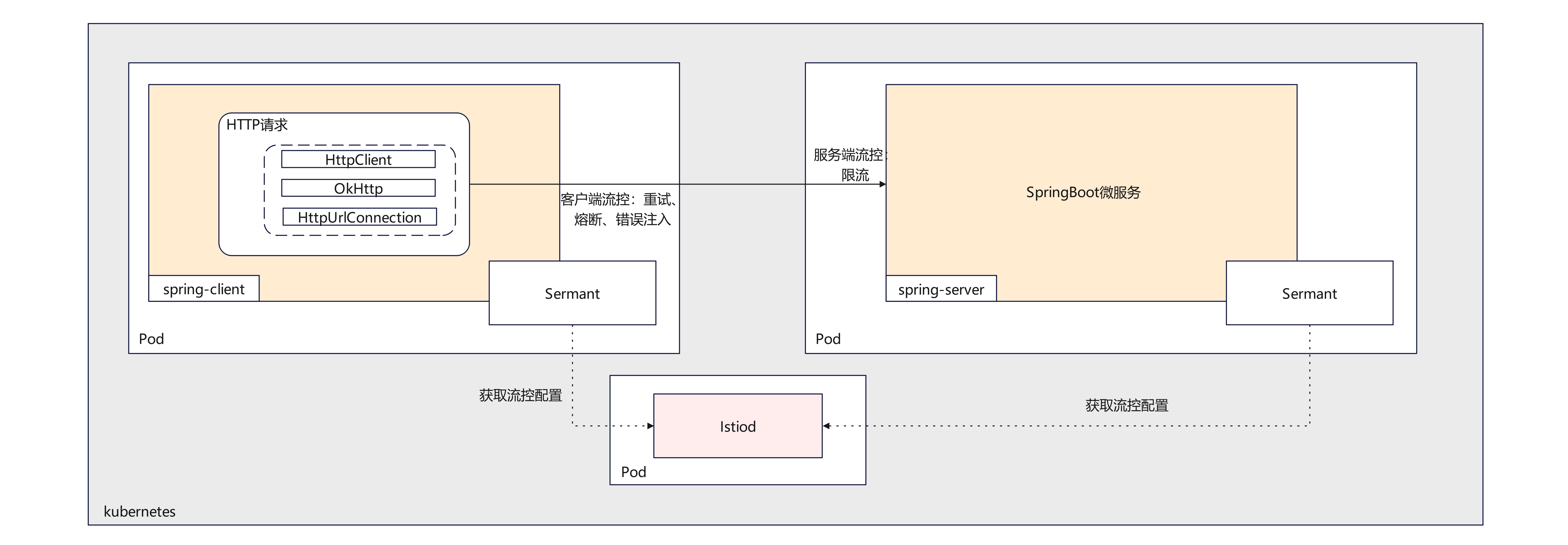 本次2.2.0版本,xDS流控支持对HttpClient、OkHttp、HttpURLConnection框架发起的HTTP调用加入流控能力,包括重试、熔断、错误注入,支持对SpringBoot等服务端框架执行限流能力,如下图所示: