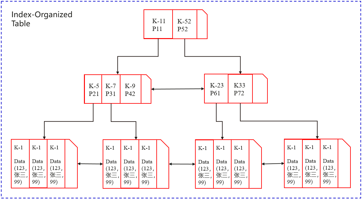 相比之下,索引组织表采用索引排序的方式存储,如图3所示,树结构的叶子节点不仅存放索引键,还存储主键,使得数据长度相对较长,对查询更为友好。但在大量数据插入时,需要寻址且产生大量随机写,可能导致数据写入过程缓慢。