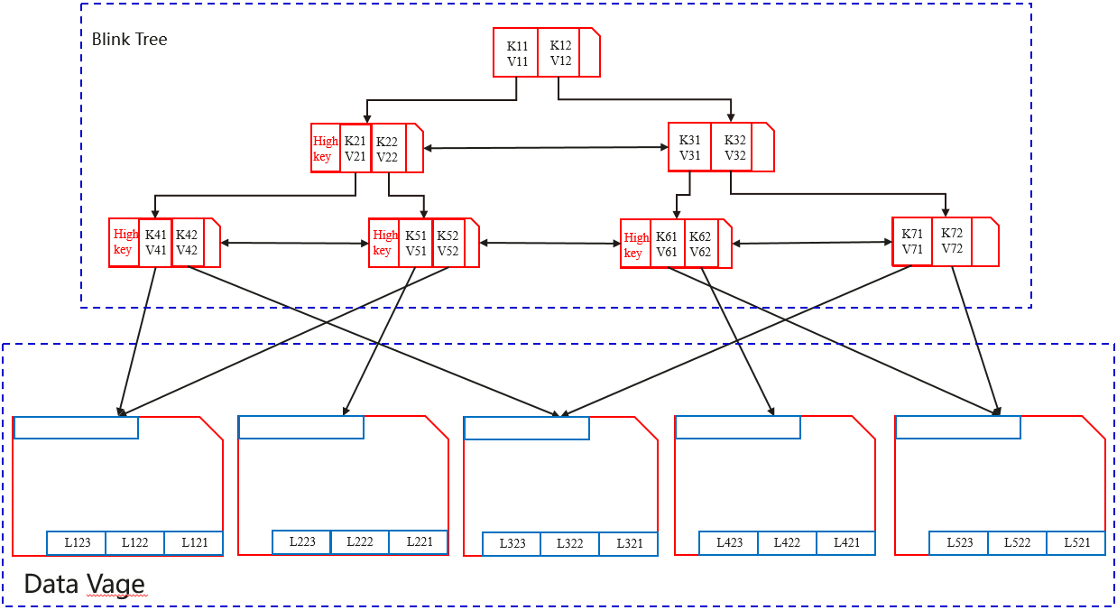 对于堆组织表,数据库以页为单位(如8KB)分配存储空间,并按照数据写入顺序将行存储在页内。一个表空间内可以关联多个页面,使得整体表空间大小保持稳定;索引结构,通常采用B-树或B+树,用于关联堆表中的每行数据,不仅存储索引键,还存储行指针,使得数据长度相对较小。堆组织表和普通索引结构,如下图2所示。