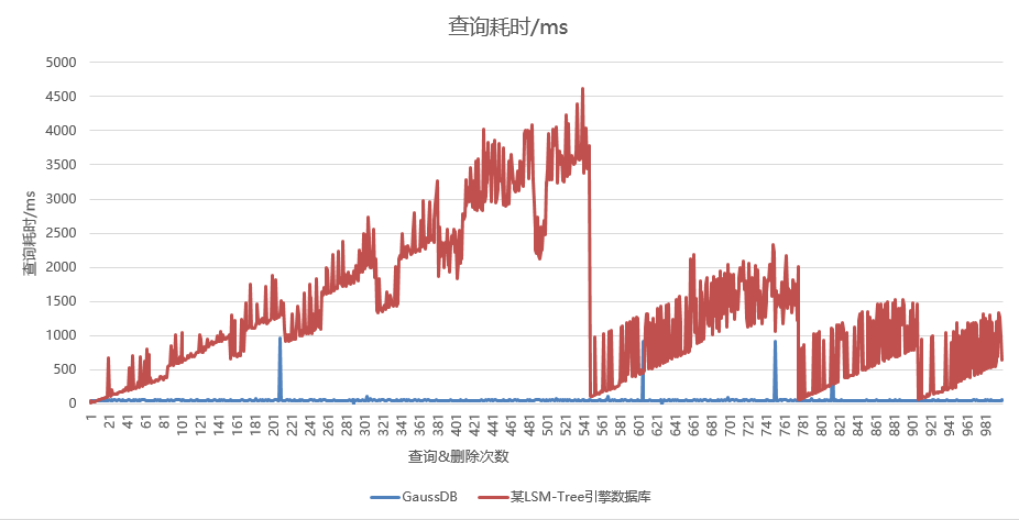 相比之下,GaussDB的查询耗时基本保持平稳。这得益于GaussDB的引擎采用Blink-Tree索引堆组织表结构和高级压缩技术。高级压缩实现了存储空间的重复利用,使得整体存储空间变化相对稳定,确保了业务查询耗时稳定。