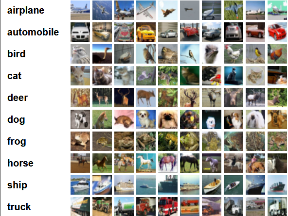 cifar数据集共有60000张彩色图像,这些图像是32*32,分为10个类,每类6000张图。有50000张用于训练,构成了5个训练批,每一批10000张图;另外10000用于测试,单独构成一批。测试批的数据里,取自10类中的每一类,每一类随机取1000张。抽剩下的就随机排列组成了训练批。注意一个训练批中的各类图像并不一定数量相同,总的来看训练批,每一类都有5000张图。