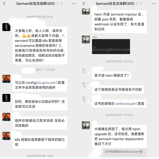 在过去的一年中,我们通过微信群答疑、Issue解答等方式帮助许多企业用户和开发者解决了在服务治理结构选型和演进、接入Sermant落地实践过程中的关键问题,消除了服务治理场景中的许多痛点。