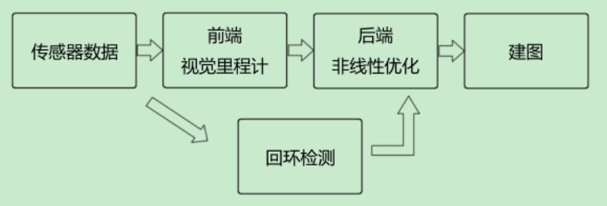 (3)SLAM算法根据依赖的传感器不同,可以分为激光SLAM和视觉SLAM,前者是激光雷达,后者是能提供深度信息的摄像头,如双目摄像头,红外摄像头等。除此之外,SLAM算法通常还依赖里程计提供距离信息,否则地图很难无缝的拼接起来,很容易跑飞。一个经典的SLAM 流程框架如下,其中回环检测时为了判断机器人有没有来过之前的位置。
