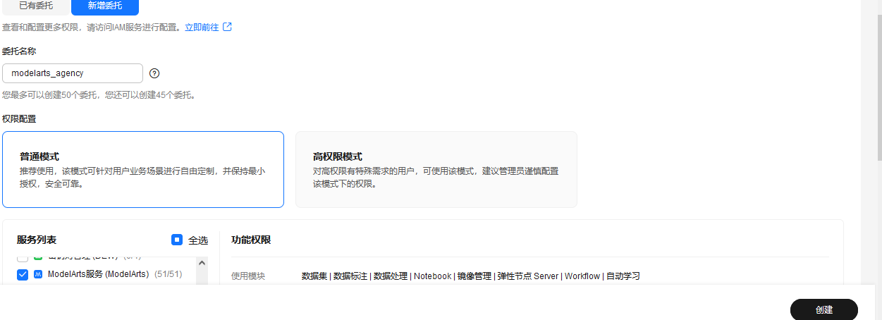 - ModelArts 使用过程中涉及到 OBS、SWR、IEF 等服务交互,需要用户配置委托授权,允许 Modelarts 访问这些依赖服务。若没有授权,ModelArts 的部分功能将不能正常使用。