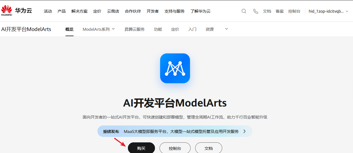 需要先登录到华为云--》产品--》进入到“AI开发平台ModelArts”界面