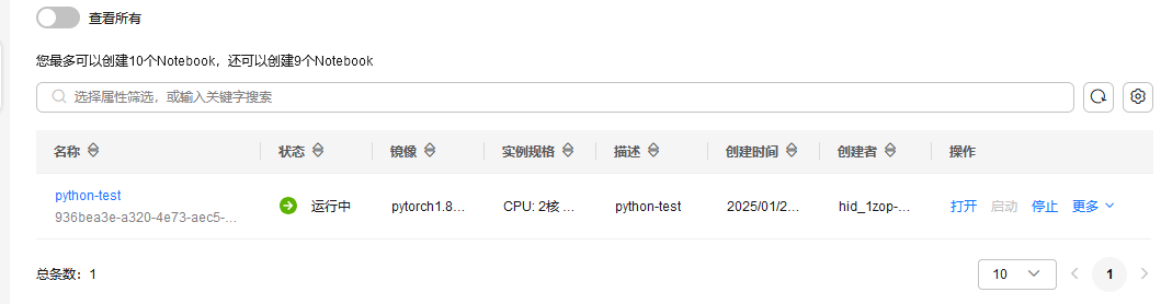 创建任务提交成功,点击页面的“返回Notebook列表”,返回Notebook列表页,等待Notebook创建成功,创建成功后状态会变成“运行中”,如下图所示: