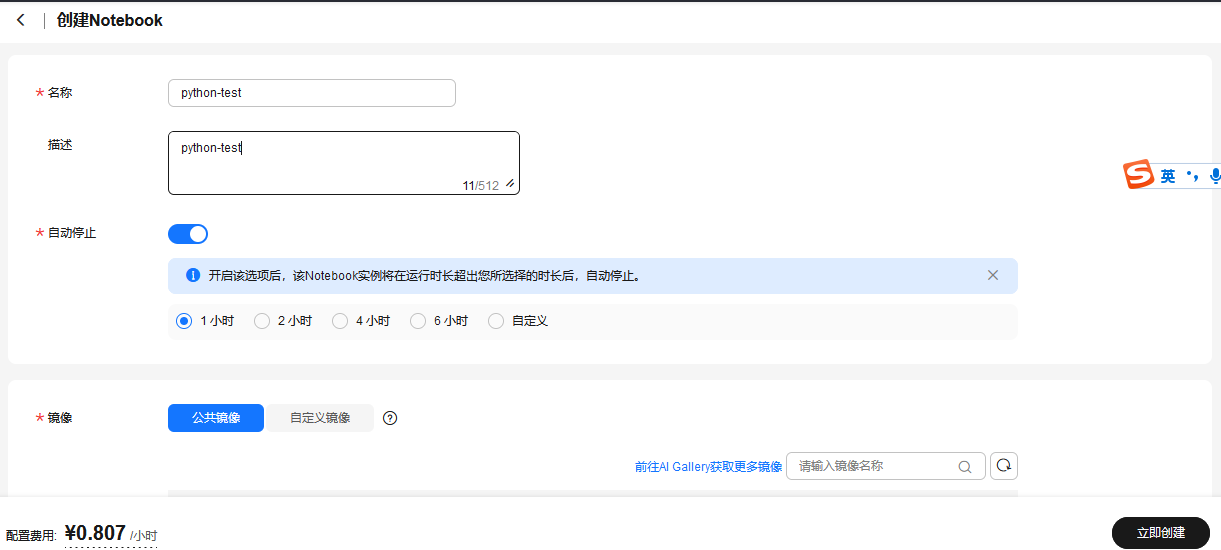 单击“创建”,进入“创建Notebook”页面,填写 Notebook 的基本信息,包含名称、描述、是否自动停止,填写 Notebook 详细参数,如工作环境、资源规格等。可以使用OBS或EVS存储资源均可。