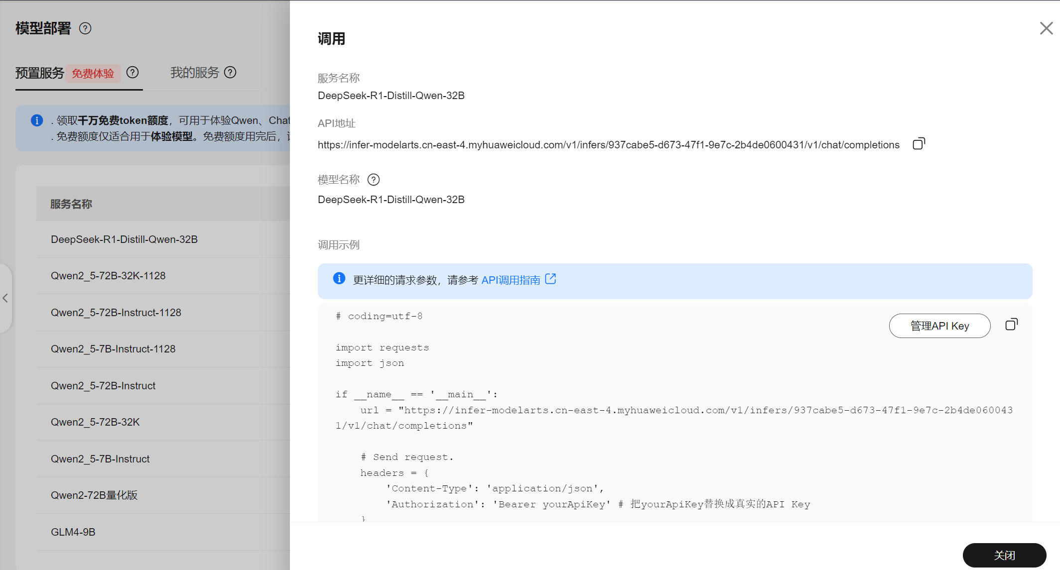 步骤四:进入首页,点击立即领取,跳入模型部署-预置服务,选择想体验的服务,如:DeepSeek-R1-Distill-Qwen-32B,点击体验