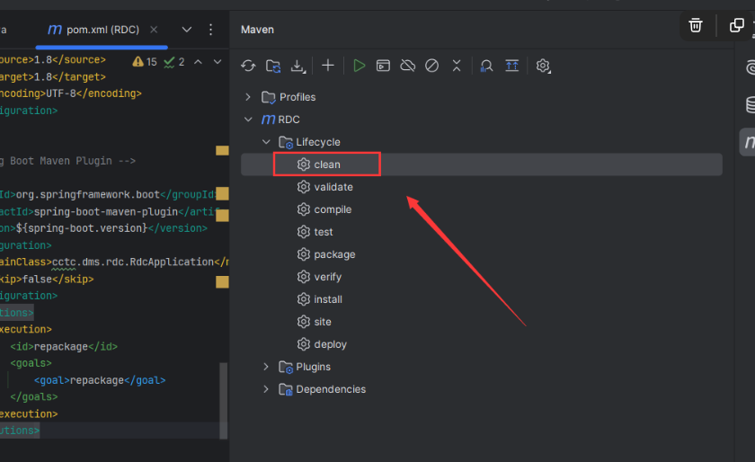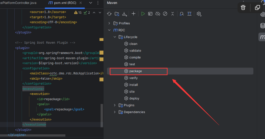 mainClass:指定应用程序的主类,必须包含main方法。请将xxx.xxx.rxxxdc.xxxApplication替换为你实际的主类路径。skip false / skip:确保插件不会被跳过,默认情况下可以省略该配置。executions:指定在构建过程中执行repackage目标,重新打包 JAR 文件。