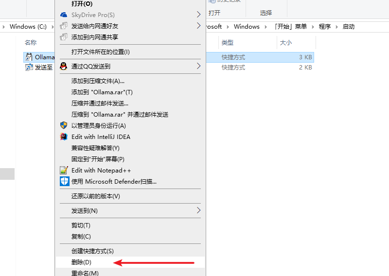 Ollama 默认会随 Windows 自动启动,可以在「文件资源管理器」的地址栏中访问以下路径,删除其中的Ollama.lnk快捷方式文件,阻止它自动启动。