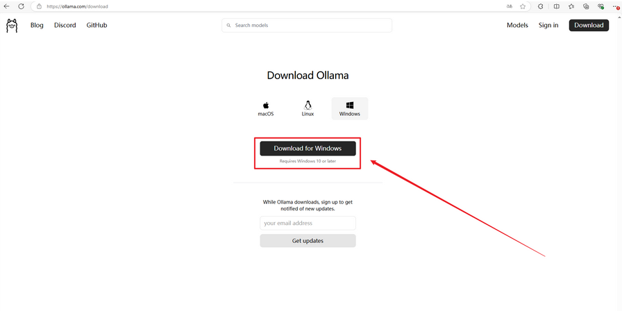 访问 Ollama 官方网站 并下载适用于 Windows 的安装程序。