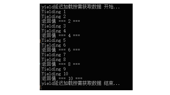 Console.WriteLine("yield延迟加载按需获取数据 结束...");