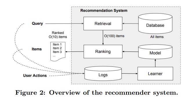当用户访问app store的时候会生成一个请求Query,这个请求当中会包含用户以及上下文的特征。推荐系统会返回一系列的app,这些app都是模型筛选出来用户可能会点击或者是购买的app。当用户看到这些信息之后,会产生一些行为也就是user action,比如浏览(没有行为)、点击、购买,产生行为之后,这些数据会被记录在Logs当中,成为训练数据。