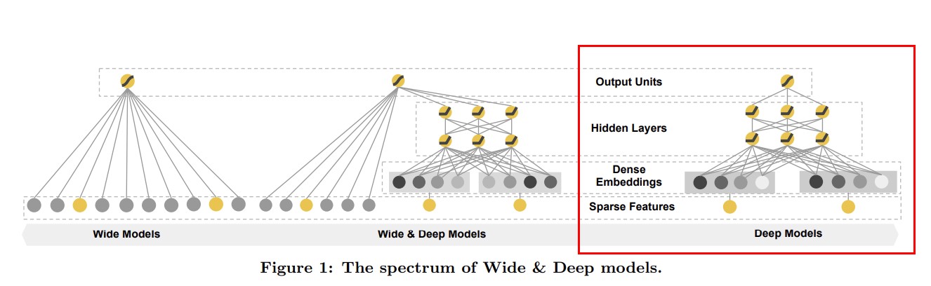 WideDeep网络中的Deep部分则是一个前馈神经网络(下图右侧部分,已框出来),其输入是一个sparse的feature,该输入通过神经网络第一层后将被转化成一个低维度的embedding向量,网络训练的是这个embedding,主要是用来处理类别特征,比如item的类目、用户的性别等。