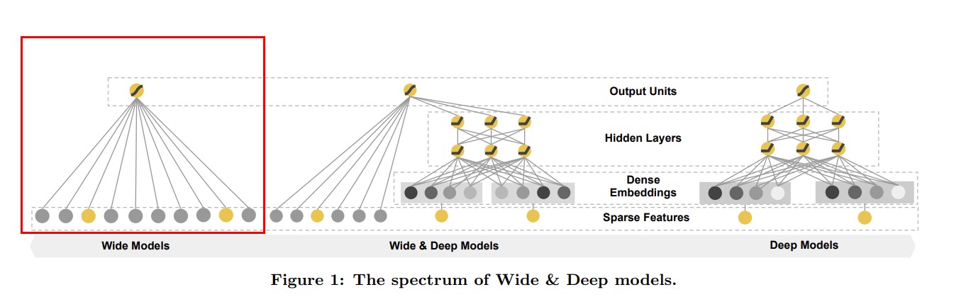 WideDeep网络是由两部分组成,一部分是Wide模块,另一部分是Deep模块。其中Wide部分是一个广义线性模型(下图中左侧部分,已框出来)即y = W^Tx + \hat{b} ,其中,y 是需要预测的结果,x 是一个d维度的特征向量。w 是模型参数,b是偏置。特征集包含原始输入特征和转换特征。