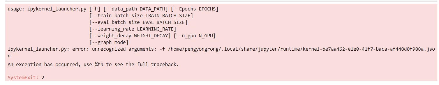 IDE当中代码使用了parser.parse_args(),当在jupyter下调用时出错,这是因为调用parser.parse_args()会读取系统参数:sys.argv[ ],命令行调用时是正确参数,而在jupyter notebook中调用时,sys.argv的值为ipykrnel_launcher.py。