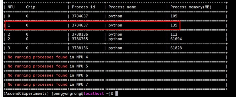 内存使用情况: 整个训练过程的内存使用情况可以通过"npu-smi info"命令在终端查看,因此本文实验只用到了单个npu卡(也就是chip 1),前面指定device=1,内存占用约135M,对内存、精度或性能优化有兴趣的可以自行尝试进行优化,这里运行过程中也有其他程序在运行,因此本实验用到的网络所需要的内存已单独框出来。