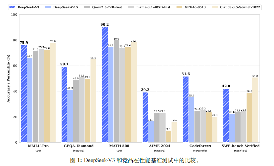 在教育类基准测试(如MMLU、MMLU-Pro和GPQA)中,DeepSeek-V3得分分别为88.5、75.9和59.1,优于所有其他开源模型,与领先的闭源模型(如GPT-4o和Claude-Sonnet-3.5)相当,缩小了开源与闭源模型的差距。